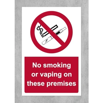 No smoking or vaping on these premises Safety sign Pack of 2 3mm Aluminium signs Digitally printed and laminated for extra durability. 10mm Radius rounded corners, no sharp edges. All signs come with a 5-year warranty. All our signs are UV resistant meaning they will not fade in sunlight. Suitable for indoor & outdoor use.