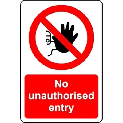 No unauthorised entry safety sign Self adhesive sticker 300mm x 200mm Digitally printed and laminated for extra durability Remove backing film and apply to dry, smooth, oil free surface.