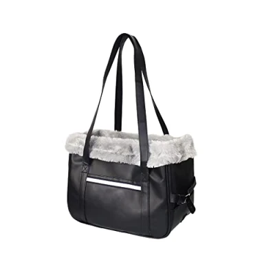 Durable faux leather, washable For dogs / cats up to approx. 5 kg With 3 utensil compartments With carabiner and removable base With reflective stripes