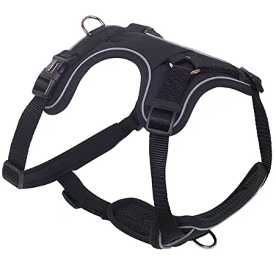 Padded mesh fabric With 5 adjustable straps Double closure at belly With two D-rings on the back and chest for better control With reflective strips