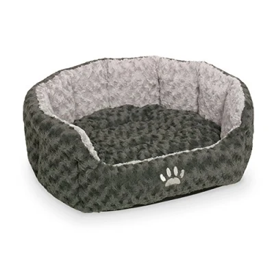 For dog/cat soft plush comfort bed with reversible cushion oval bed Soft plush dark-grey- light grey, with reversible cushion Washable upto 30c (hand wash only) Size 86 x 70 x 24 cm