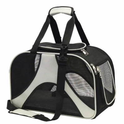 Durable microfibre, washable For animals up to approx. 8 kg One utensil compartment With carabiner and removable base Side panels can be fully opened