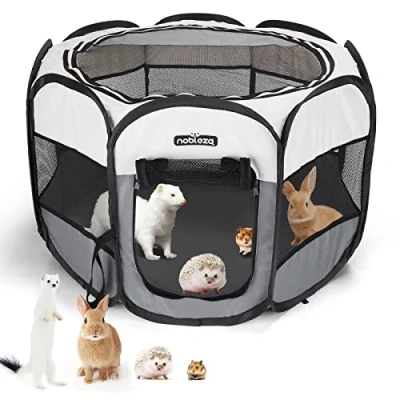 FOLDABLE AND PORTABLEPET PET PLAYPEN: Sturdy pet playpen provides a safe and comfortable play space for your pets both indoors and outdoors. Nobleza pet pen is foldable, so you can easily put it anywhere in your house. Even if you are going out for a hike, you can put it in the trunk of your car without taking up too much space. Portable and foldable design makes it a perfect choice for family,travel and camping. GREAT VENTILATION: Nobleza pet fence is made of waterproof 600D oxford cloth, 7 mesh windows around the playpen, mesh top and roll up door with smooth zippers provide good ventilation and visibility. Giving your pet to stay in peace at ease. EASY TO CLEAN: Nobleza palypen can be wiped with wet cloth, or washed with water and brush, and then put in the sun dry. No tedious cleaning steps. INDOOR AND OUTDOOR PET PEN: Nobleza pet pen can be used indoors, providing an independent play space for pets, without worrying about messing up the room, and it can prevent the risk of pets running and losing. Nobleza pet pen is suitable for dogs, puppy, cats, kitten, rabbits, guinea pigs, hamster, mice and other pets. Our Pet Pen Dimensions-Unfolding Size: S:24.4x24.4x17.7 inch, M:32.3x32.3x22.8 inch, L:42.9x42.9x22.8 inch; Folding Size: S:17.7*11.8 inch, M:22.8*13.8 inch, L:22.8*18.9 inch. WARNING: When using this playpen for young and small pets, please use it under the supervision of a person to avoid pet movement causing the playpen to fall down and cause accidents.