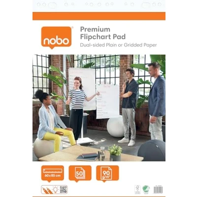 Versatile, dual-sided flipchart paper pad with both plain and gridded paper, 50 sheets of paper with a strong page binder for easy use The high quality flipchart paper is perforated and pre-punched with 15 holes allowing it to fit on most flipchart easels Printed using solvent-free, water-based inks; grid size 50 x 50 mm Paper sourced from responsibly managed European forests, FSC and Nordic Swan Certified; plastic free packaging Contents: 1 x Nobo Premium Flipchart Pad 60x85cm, 50 sheets, Dual-sided plain/gridded, 1915657