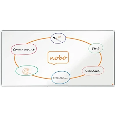 EurofficeSteel magnetic whiteboard surface for moderate use. Size: 1800x900mm. Bordered by a modern stylish aluminium trim. Fixed with a traditional through corner wall mounting. Large whiteboard pen tray. Supplied with a Nobo whiteboard pen.