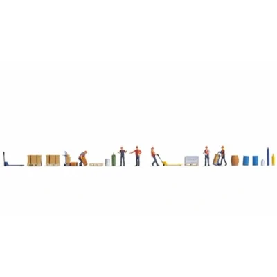 1 x warehouse worker with sack truck, 1 x warehouse worker with box, 1 x warehouse worker with hand lift truck, 3 x warehouse worker and cargo guide, 1 x hand lift truck, 1 x sack truck, 1 x pallet, empty 2 x pallets with load, 1 x grid box on pallet, 1 x small box, 4 x different barrels, 4 x different gas bottles Hand-coloured Not a toy, model item