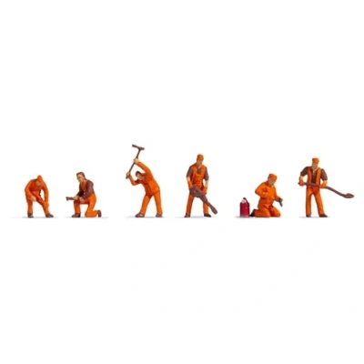 Realistic representation: figures in typical poses such as welding or with sledgehammer, ideal for realistic scenarios at the station. COMPREHENSIVE SET: Includes 6 figures in orange workwear, perfect for equipping your model railway system. HAND COLORATED: The figures are simply painted, ideal for budget populations of model locations and scenes. Versatile: perfect for use on platforms, squares, villages, cities and fields in your model world. You will receive: 6-piece track building team, hand-coloured with attention to detail, especially for the TT gauge., Manufacturer: NOCH GmbH & Co.KG