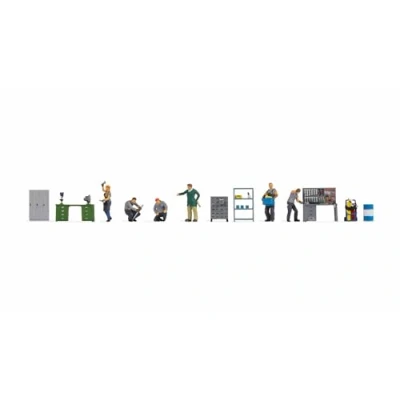 Detailed scene: the workshop equipment contains 6 model figures, workbenches, cabinets and other accessories for realistic representations. High-quality material: made of high-quality material, the hand-coloured figures and furniture are durable and robust. ✅ VERSATILE POSITIONS: Includes figures in different postures such as standing, kneeling and moving, ideal for authentic scenes. Mixed gender: figures in male and female design, suitable for any workshop scene on your model train. Suitable for H0: The 1:87 figures are perfect for the track gauge H0 and fit seamlessly into your model railway system., Manufacturer: NOCH