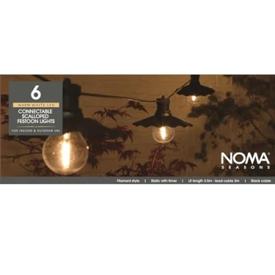 General description Create a unique statement in your garden with the stunning Noma Scalloped Saucer Bulb Festoon String Lights. These lights are the perfect addition for outdoor dining and entertaining, providing soft lighting that adds an ambient glow as the sun goes down. Accent your garden seating areas with style using these scalloped saucer festoon lights, which look beautiful in gardens of all sizes, from small courtyards to vast terraces. They can be hung from trees and bushes, creating a calming atmosphere suitable for both outdoor and indoor use. Additionally, they make a great addition for Christmas, weddings, and parties, combining garden decor by day with stunning light by night. Technical specifications Number of lights: 6 Power source: Low voltage mains Connectable: Yes, up to 6 sets can be joined together Memory timer: 8 hours Compatibility and accessories Can be clipped onto hooks, branches, or fence screws Usage Ideal for outdoor dining and entertaining Perfect for