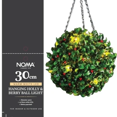 ENCHANTING LIGHTS: Add a touch of magic with this holly & berry ball, featuring 40 warm white LEDs for a captivating display EASY TO USE: Battery operated with a convenient timer function, making it easy to hang and control the radiance FEATURES: Versatile decor suitable for any festive setting; The lights provide festive illumination and create a delightful ambiance DECORATIVE TOUCH: Enhance your space with this decorative piece that adds warmth and charm to your home or garden environment VERSATILE USAGE:NOMA Holly & Berry Ball offers an easy hanging solution, perfect for creating an inviting atmosphere for any occasion