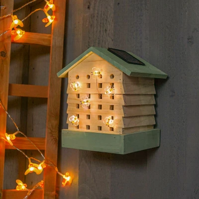General description Give nature a helping hand with this insect bee hive hotel featuring solar lights. It’s a great way to populate your garden with bees, helping them thrive while also providing colorful ambient lighting. This bee haven light can be used anywhere outdoors, powered by an integrated solar panel that charges the included rechargeable batteries. An intelligent light sensor automatically illuminates the 6 warm white LEDs at dusk, housed within 6 adorable bee-shaped decorations. With this insect hotel, you’ll find the perfect habitat for bees, providing a cozy, warm, and safe spot for them throughout the year. Technical specifications Dimensions: 20.5 cm (H) Light source: 6 warm white LEDs Power source: Integrated solar panel with rechargeable batteries (included)