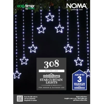 BRIGHTEN UP: Create a stunning and captivating indoor ambiance with 308 bright white LEDs ELEGANT DESIGN: Star wire curtain light adds starry elegance to your Christmas or wedding decor EASY INSTALLATION: Quick setup for instant housewarming or birthday party decoration, energy efficient too VERSATILE DECOR: Ideal for holiday celebrations, creating a magical atmosphere for any special occasion QUALITY LIGHTING: NOMA provides quality products known for their durability and reliability in lighting solutions