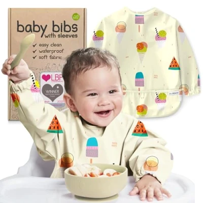 Holy guacamole that looks good! Watch your baby let loose in their new baby bibs with sleeves and get excited about food as they try solids and start weaning. A baby weaning essential must have! Capture that #lemonface. Flex that pincer grip. Bolognese Proof!? We assembled a crack team of messy eaters to road test our baby weaning bibs. Squished strawberry, mushed banana and flying peas are no problem. This baby bibs with sleeves can handle anything you can throw at it. “Operation Tidy Up” is easy peasy, you can either wipe clean these waterproof bibs or put them in the washing machine. The quick drying fabric will be ready by snack time. Keep those adorable outfits clean and cut down on wardrobe changes. “Don’t Worry They’ll Grow Into it!” These long sleeve bibs come in one size (Medium), so will fit everyone from a Skinny Minny to a Chunky Monkey. This baby food bib has snap on buttons and elasticated cuffs for a comfortable and snug fit. Gift Me Baby One More Time - Our baby apron bibs with long sleeves is a beautiful soft-touch fabric, carefully packaged in a presentation box. Add it to your registry, it’s a perfect Baby Shower Gift!