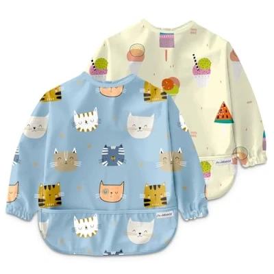 Nombear Baby Bibs with Sleeves for 6 24 Months, 2 Pack Easy Wipe Clean, Machine Washable Weaning Bib Sleeves, Waterproof Long Sleeve Bibs, Alternative to Silicone and Coverall