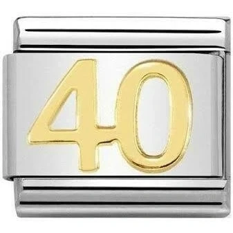 The perfect charm to celebrate a milestone occasion, this 40 charm can symbolise a birthday or anniversary. Placed on a stainless steel link, the number 40 is crafted with 18k gold. A touching present they can add to their Nomination classic composable bracelet. Stainless steel18k goldNumber 40Celebrate a special birthday or anniversary