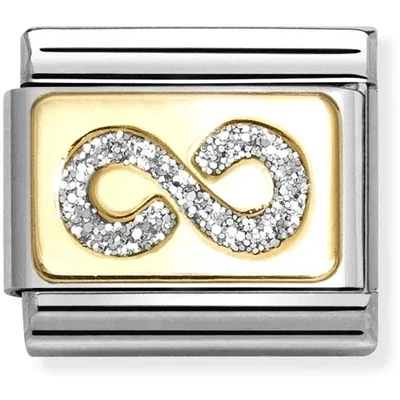 Representing infinite and unending love, this Nomination charm adds sparkly grace to your accessories. Crafted with 18K gold plating, this stainless-steel charm features a glittery infinity symbol on a gold-plated base. The perfect gift for someone you love deeply.Stainless steel18K gold platingSilver infinity symbolSilver charm