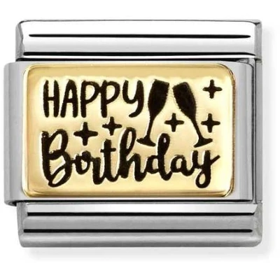 Wish a special someone a very happy birthday with this adorable charm from Nomination! Placed on a stainless steel base is a 9k rose gold plate. Etched in black enamel detailing are the words: "Happy Birthday" A party hat and some dainty hearts add a fun finish to this charm. A great alternative to a card! Stainless steel9k rose gold "Happy Birthday" Enamel details