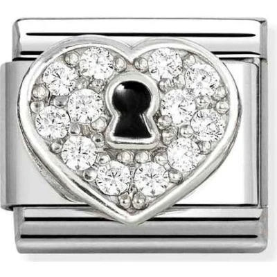 Unlock a little sparkle with this beautiful charm from Nomination. Crafted in stainless steel, this charm features a 3D heart motif adorned with white pavé crystal details, and a black enamel keyhole detail. A way to add an adorable touch into your jewellery selection, this charm would make a beautiful gift. Stainless Steel 3D Heart motif White pavé crystals Black enamel keyhole Composable charm