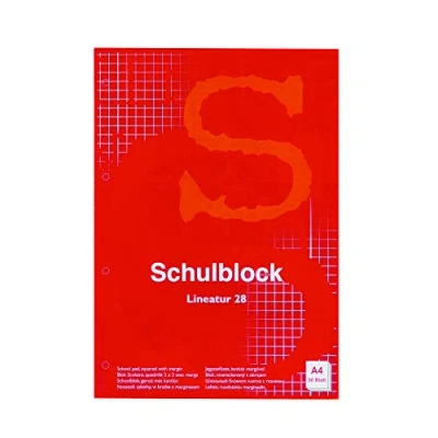 School notepad with A4, squared Wood-free white paper, 60 g/m² Type 28 ruling (squared with margin inside and outside) Glued, with 4 holes Pack of 10