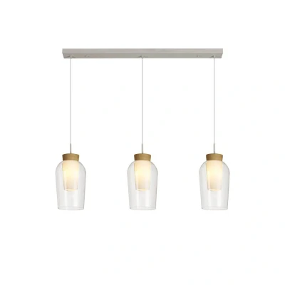 Nora Linear Pendant, 3 Light Adjustable E27, White/Wood/Clear Glass With Frosted Inner