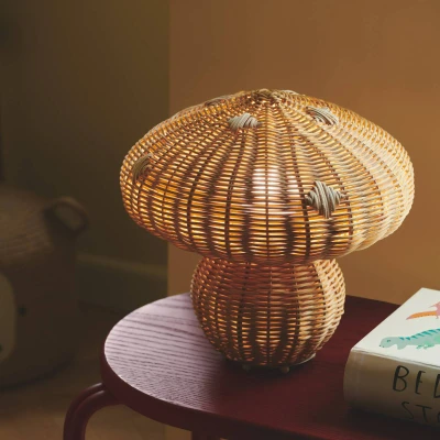 Lights.coAllie table lamp with a lampshade made of woven rattan The Allie table lamp is shaped like a mushroom. It consists entirely of a natural-coloured rattan shade with individual decorations on the top and is equipped with a 150 cm long cable with an integrated switch. The fine gaps in the rattan weave create a beautiful interplay of light and shadow around the light. Allie is a table lamp that blends very well into naturally designed living spaces and is also ideal for the bedroom or children's room.