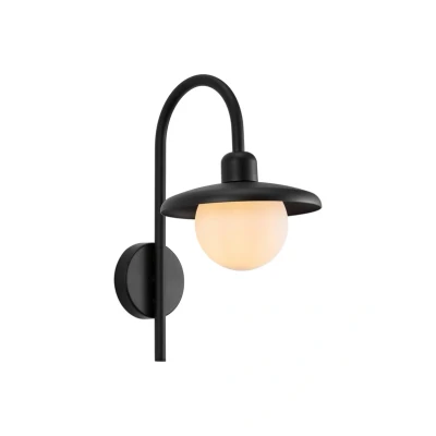 Lights.coBerlo outdoor wall light with curved arm and double shade The Berlo outdoor wall light consists of a round wall mount with a curved arm that holds the lampshade at its end. This consists of a black, wide-open metal shade and a sphere of opal white plastic inside it, which acts as a diffuser and allows the light to shine in all directions without glare. The bulb (E27) is not included.
