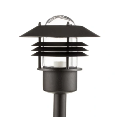 Vejers Garden Lamp Black is a classic outdoor model with a special expression that is nostalgic and timeless at the same time. The design is characterised by a multi-layered shade that surrounds a clear glass dome where the light source is located. The transparent dome allows light to penetrate freely on all sides, while the shade panels prevent glare and gently direct the light downwards for a practical orientation light. Note - This product will patinate over time and is not suitable for use in coastal areas. The luminaire is made of galvanised steel, making it a robust and saltwater-resistant model that is particularly well suited to Nordic climates and coastal areas. As the luminaire also has a high encapsulation class, it is impervious to the effects of wind and weather, ensuring reliable lighting all year round. The lamp comes in several colour variants and is part of a whole series. It is also available in other variants with a motion sensor.