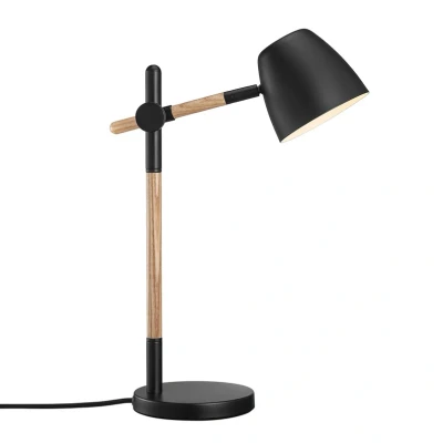 Lights.coDesk lamp Theo with ash wood elements The desk lamp Theo is designed from a successful mix of light wood and black metal. The shade can be rotated and also tilted up and down to direct the light cone as desired. The lamp rod is partly equipped with ash wood and fits well with other wooden furniture. In addition to the Nordic interior style, Theo also fits wonderfully into modern environments and also brings a sustainable component with it, as the wood is FSC certified. A switch is located on the supply line.