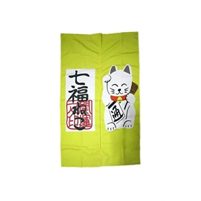 Maneki Neko Noren Material: Cotton Noren Maneki Neko Dimensions: approx. 90 cm wide, 150 cm high Noren Maneki Neko colour: yellow and dominant white Japanese decoration – Nippones traditions Admire this very pretty Japanese Noren with the image of Maneki Neko, the famous Japanese Lucky Cat