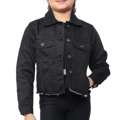 NOROZE Kid's Denim Jacket Cropped Girls Ripped Self Fabric Distressed Hem Casual Jean Coat (5 6 Years, Black)