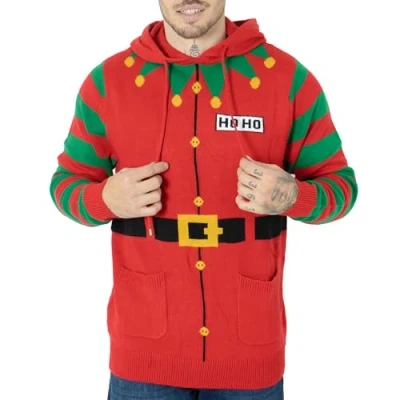 [Design & Look]: NOROZE presents the Men’s Christmas Jumper Hoodie, a bold and fun festive jumper designed for men. Featuring detailed 3D motifs of Elves, HoHo Santa, and Candy Canes, this knitwear adds humour and holiday cheer to your winter wardrobe — perfect for office parties, family dinners, or Christmas get-togethers. [Material & Feel]: Crafted from 100% Acrylic, offering a soft, warm, and stretchable knit that feels cozy all day. Durable yet comfortable — ideal for layering or standalone wear. [Versatility]: Whether you’re celebrating with friends, attending a themed Christmas event, or relaxing at home, this jumper adds the perfect mix of comfort and festive spirit. [Key Features]: Includes Long Sleeves, Ribbed Hem and Cuffs, 3D Pom Pom Buttons, and a Hood for added comfort. The striking Christmas design makes it a must-have addition to your seasonal wardrobe. [Size and Colour]: Available in men’s regular sizes and in vibrant Christmas colours such as green, red, and candy cane — making it perfect for creating a cheerful festive look.