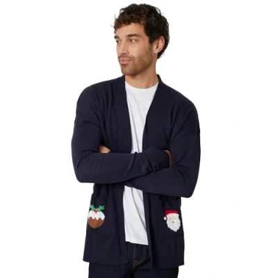 Material - The NOROZE Men's Cardigans are crafted from 100% acrylic, offering a soft, breathable and durable comfort against your skin. This high-quality material ensures long-lasting wear and all-day comfort. Design - Upgrade your wardrobe with this cardigan, blending classic style with lasting comfort. Festive pudding and Santa prints on the pockets add a cheerful touch, while the open-front design offers a modern alternative to a shawl-style closure. Versatile - This cardigan is so cute and anyone can wear it and show their holiday spirit. It's perfect for family gatherings office parties or any festive occasion. Wear it with jeans and it's casual or dress it up with some slacks and it's more dressed up. Features - NOROZE Christmas jumpers bring vibrant colours and bold patterns to brighten the holiday season. They feature ribbed cuffs and hems for added warmth and style. Soft and cosy, they're perfect for staying comfortable on chilly days and nights. Size and Colour - The NOROZE Christmas Men's cardigan is available in Small, Medium, Large, XL, and 2XL, ensuring a perfect fit for everyone. Offered in traditional Christmas colours, including Navy it’s easy to find one that suits your style or event theme.
