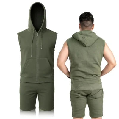 γππππππ & ππππγIntroducing our Men's Sleeveless Sweatshirt Hoodie Top Short Tracksuit Set, designed to offer comfort, style, and versatility. This top features a sleek sleeveless design that can be easily layered for a sporty look. The hoodie adds a touch of urban fashion, making it perfect for different occasions. γππππππππ & π πππγCrafted from a soft blend of 60% cotton and 40% polyester, this top ensures breathability and comfort, while the hoodie provides extra warmth during colder days. You can wear it all day long without feeling weighed down or uncomfortable. γπππππππππππγThis tracksuit set is a great addition to any wardrobe, as it can effortlessly transition from gym sessions to casual outings. Wear it over a t-shirt for a laid-back look or pair it with your favourite jeans for a more stylish appearance. γπππ π πππππππγThe hooded tracksuit features a practical hood that provides added warmth and a relaxed, comfortable fit. The sleeveless design allows for easy movement, making it a versatile choice for any season. γππππ πππ ππππππγYou can choose from classic colours such as Black Charcoal, Grey, Khaki, and Navy, and a range of sizes from S to 2XL, to find the perfect fit that suits your style. This must-have outerwear piece is the perfect blend of comfort, style, and functionality, and is sure to elevate your wardrobe.