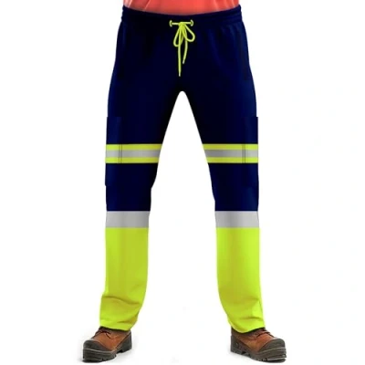 NOROZE Mens Hi Vis Trousers Work Utility & Safety with Reflective Tape Two Tone High Visibility Jogging Bottoms, Combat Side Pocket Overtrousers, Lightweight (S, Style 1: Neon Green/Navy)
