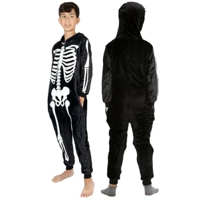NOROZE Unisex Kids Boys Halloween Skeleton Shark Onesie Costume Girls Fleece Zip Up Hooded Onesies Pajamas Loungewear Jumpsuit Sleepsuit Playsuit Pyjamas (11 12 Years, Black)