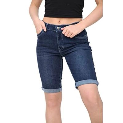 NOROZE Women's Ladies Knee Length Denim Stretchy Bermuda Shorts Contrast Turn Up Cropped Jean Capri Pants Rolled Hem Casual Summer Classic Cotton with Pockets