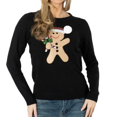 NOROZE Women's Xmas Jumper Merry Ladies Elf Pullover Knitted Sweater (10, Gingerbread Candy Cane Black)