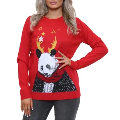 NOROZE Women's Xmas Jumper Merry Ladies Elf Pullover Knitted Sweater (12, Panda Red)