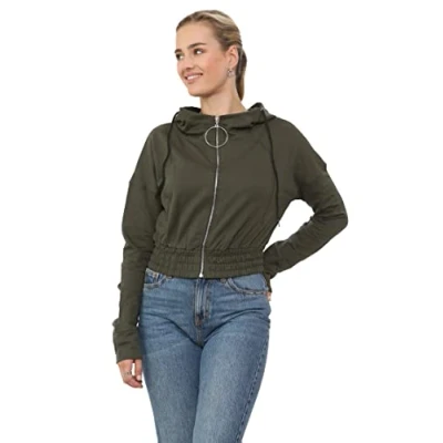NOROZE Women's Zip Crop Hoodie Ladies Plain Sweatshirt Cropped Top Pullover Sweater (M, Khaki)