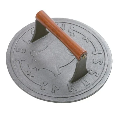 Measures: 8.75" x 8.75" x 3.25"ÔøΩ / 22cm x 22cm x 8cm Even the best cut bacon can curl, making it difficult to cook evenly. Our round Cast Iron Grill Press flattens the bacon, keeping its shape for even cooking. Features a wooden handle that stays cool to the touch. Ideal for bacon, ham, grilled sandwiches, hamburgers and quesadillas. Or use as a steak weight! In a skillet on the stovetop or outside on the grill! Includes instructions for seasoning before use, cleaning and storage. Hand wash, rinse thoroughly and dry with a paper towel - never soak cast iron. 1401 NP1401 NP1401 MPN 1401