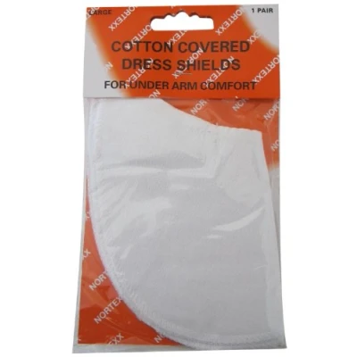 Cotton covered dress shield Made of 100 per cent cotton For under arm comfort Invisible beneath clothing Protection from odours and wet-thru staining