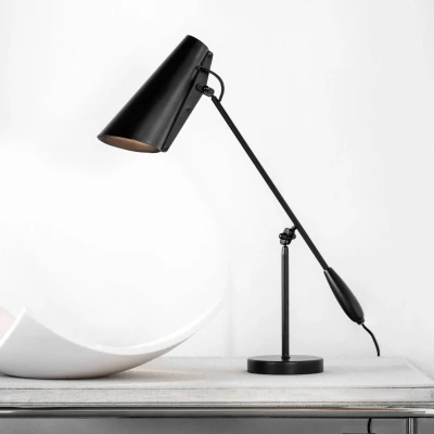 Adjustable table lamp Birdy - functional and timeless Visually simple and at the same time appealing, simple and at the same time functionally convincing - the table lamp Birdy is a prime example of Scandinavian design. The series was conceived in 1952 by Birger Dahl; the then modern design now has a slightly retro feel and thus hits the nerve of today. The shade of the table lamp is shaped as a truncated cone, which is limited at an angle at the light outlet. Thanks to the attachment via a joint, the inclination can be adjusted vertically. The upper arm not only serves as a design feature, but also offers another option for adjustment with its vertical swivel. Its rear end accommodates the cable. A round base and vertical rod form the frame.