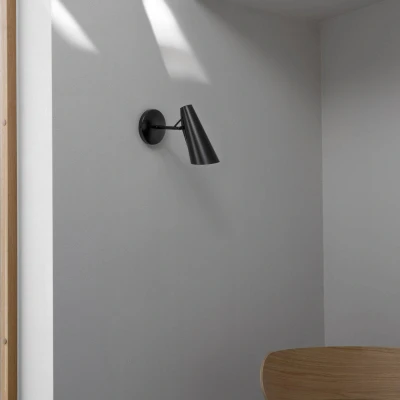 Lights.coPractical Birdy wall light with short arm The Birdy series of lights by designer Birger Dahl embodies the style of the 1950s and 1960s and is now back in vogue as an accessory with retro charm. The wall light is both simple and elegant, and also impresses as a functional light source. The latter is achieved with the joint that attaches the truncated cone-shaped head to the short, horizontal arm. The light can thus be directed downwards or forwards into the room. No wiring is required, as the wall light is equipped with a plug cable and switch.