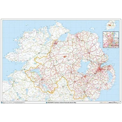 47 x 33.25 inches. Laminated. Flat map, tubed for shipping. The Northern Ireland Postcode Sector Wall Map shows detailed postcode sector boundaries along with its associated label (BT1 1, BT1 2) on a comprehensive background and is perfect for determining postcode boundaries, for sales, logistics, planning mailshots or as a regional reference guide. Map created by XYZ Maps, one of Scotland's leading map publishers. Scale 1:200,000