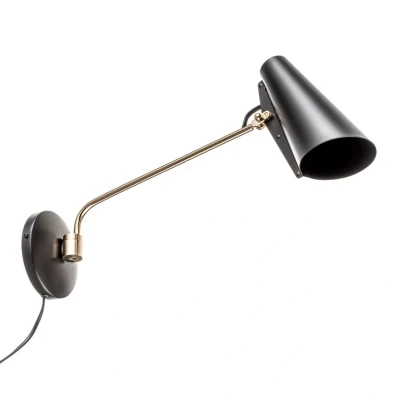 Lights.coStylish Birdy wall lamp with brass and blackThe Birdy wall lamp is ideal to illuminate larger hallways stylishly from the wall. A targeted illumination of certain corners or objects is also no problem thanks to a joint. The Birdy wall lamp has a projection of 53 cm and a height of 24 cm. The shade and the wall bracket are black, while the arm has the colour of brass.The Birdy wall lamp has a 200 cm long supply cable (black) with plug and toggle switch.