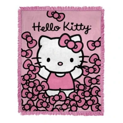 Features Hello Kitty surrounded by pink bows Detailed, triple woven throw blanket; decorative fringes around all edges; made in America Measures 46"W x 60"L Machine wash cold separately using delicate cycle and mild detergent. Do not bleach. Machine dry separately on gentle cycle. Remove promptly. Do not iron. MADE IN THE USA; Made of 100% Acrylic.Age range description: All Ages.Target gender: unisex