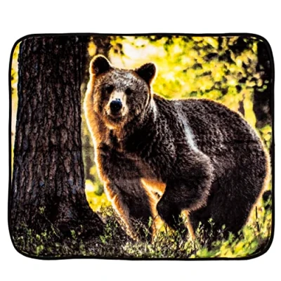 Features a bear walking next to a tree Super plush, warm and cozy; rich, saturated colors; exceptional durability; decorative binding around the edges. Measures 50"W x 60"L Machine wash cold separately using delicate cycle and mild detergent. Do not bleach. Machine dry separately on gentle cycle. Remove promptly. Do not iron. Made of 100% Polyester