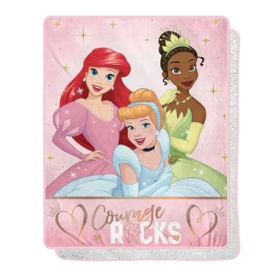 Features princesses Ariel, Cinderella and Tiana on a pink background Super soft, silk touch fabric front; plush, neutral color sherpa back; decorative binding around all edges Measures 40"W x 50"L Machine wash cold separately using delicate cycle and mild detergent. Do not bleach. Machine dry separately on gentle cycle. Remove promptly. Do not iron. Made of 100% Polyester