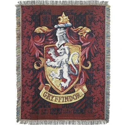 Warner Brothers' Harry Potter "Gryffindor Shield" Throw Blanket Detailed, woven throw blanket; decorative fringes around all edges Measures 48"W x 60"L Machine Washable