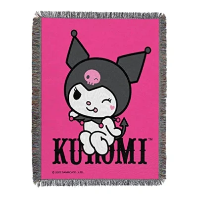Features Kuromi on a bright pink background Detailed, woven throw blanket; decorative fringes around all edges; made in America Measures 48"W x 60"L Machine wash cold separately using delicate cycle and mild detergent. Do not bleach. Machine dry separately on gentle cycle. Remove promptly. Do not iron. MADE IN THE USA; Made of 100% Polyester.Target gender: unisex